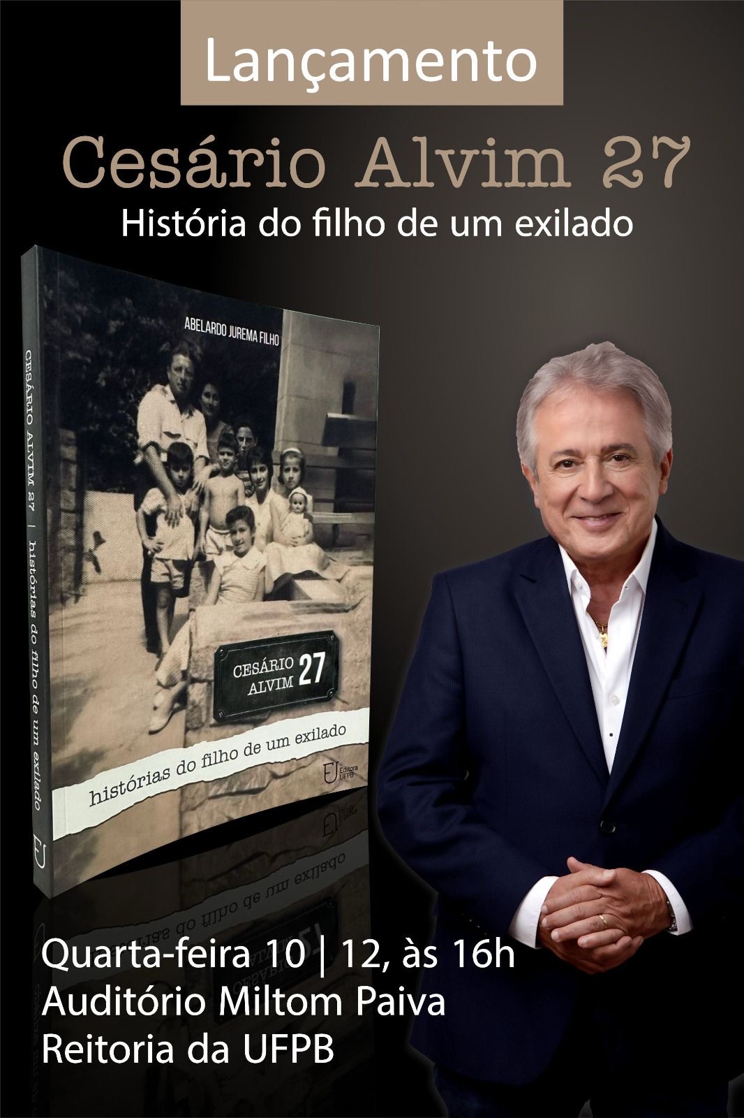 O jornalista Abelardo Jurema Filho lança nesta quarta-feira, às 16h, no Auditório Milton Paiva, na Reitoria da UFPB, o livro “Cesário Alvim 27 – histórias do filho de um exilado”. Na obra, o mais longevo colunista social da Paraíba transforma em narrativa pessoal a experiência de ter sido marcado pelo exílio do pai, o ex-ministro da Justiça Abelardo Jurema, uma das figuras centrais do governo João Goulart.