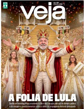 Veja – A revista traz uma representação alegórica do presidente Lula em clima de carnaval para discutir os limites entre espetáculo político e comunicação institucional. A capa provoca ao retratar a política como encenação permanente, levantando o debate sobre até que ponto a imagem pública substitui o conteúdo das decisões e das políticas de governo.