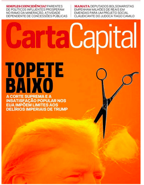 CartaCapital – A revista destaca o recuo político e institucional de Donald Trump diante de decisões da Suprema Corte e da pressão da opinião pública, simbolizado pela imagem do famoso topete sendo cortado. A capa sugere limites impostos aos impulsos considerados autoritários do ex-presidente americano, associando o momento a uma reação das instituições democráticas contra excessos de poder e narrativas populistas.