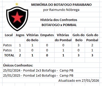 Assim, quando Botafogo e Pombal adentrarem ao Estádio Almeidão na 4a feira – 28 de janeiro de 2026 – farão o jogo de número 3 na história dos confrontos entre essas equipes.