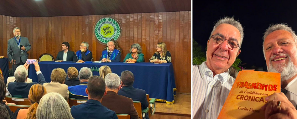 Carlos Vieira foi o centro das atenções na noite desta quinta-feira, na Academia Paraibana de Letras, durante o lançamento de Fragmentos do cotidiano em crônicas. Em clima de prestígio, o presidente da Caixa viveu uma noite especialmente simbólica, marcada também pela homenagem que recebeu ao ser agraciado com o título de sócio honorário da instituição.