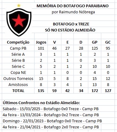 No geral já foram disputados 135 jogos, no Estádio Almeidão, entre Botafogo x Treze, nesses 51 anos de vida do Estádio. O Botafogo tem 59 vitórias (44%), o Treze tem 34 vitórias (25%). Houve 42 empates (31%).