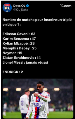 Edinson Cavani precisou de 63 partidas, Karim Benzema de 47, Kylian Mbappé de 28, Memphis Depay de 25, Neymar de 15 e Zlatan Ibrahimovic de 14. Lionel Messi, mesmo com todo o peso de sua carreira, não conseguiu marcar três gols em um mesmo jogo atuando pelo PSG.