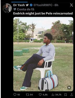 O sucesso meteórico de Endrick no futebol francês começa a produzir um efeito colateral preocupante: a elevação do garoto a um patamar que beira o delírio. Um perfil bastante popular na rede X, conhecido como Dr Yash, dono de uma conta de fã do Real Madrid com mais de 150 mil seguidores, publicou que Endrick “pode ser a reencarnação de Pelé”. A frase, além de exagerada, ajuda a criar um ambiente de cobrança desproporcional para um jogador que ainda está no início da carreira profissional. A postagem teve milhares de curtidas e dezenas de milhares de visualizações, mostrando o tamanho do alcance desse tipo de narrativa.