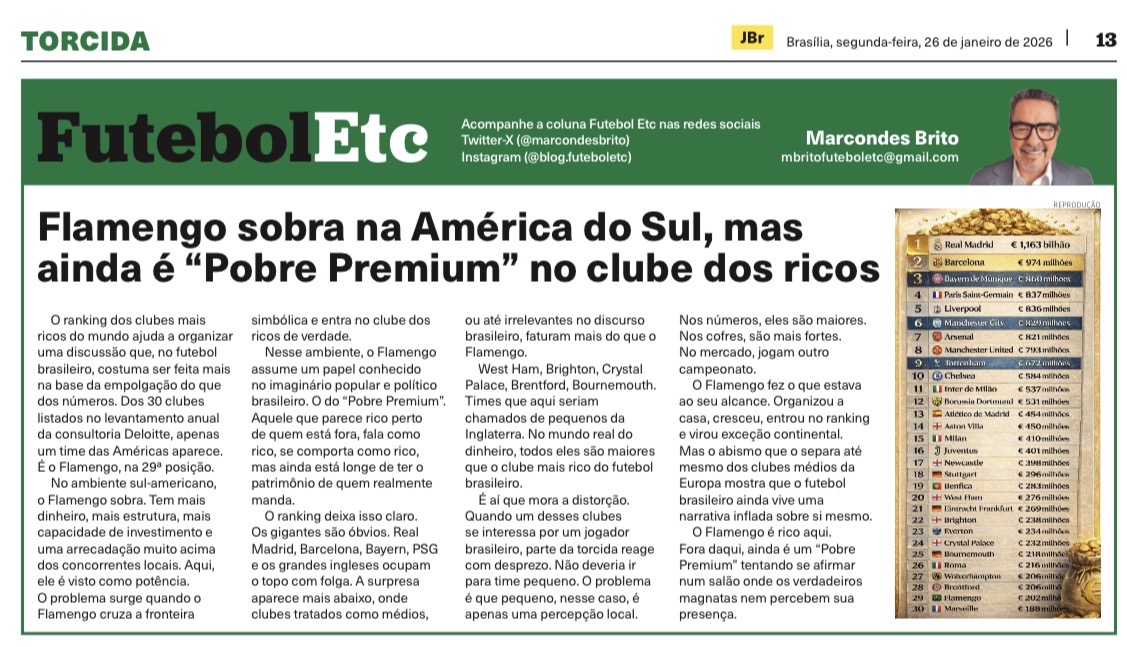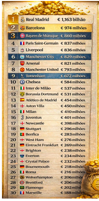O ranking dos clubes mais ricos do mundo ajuda a organizar uma discussão que, no futebol brasileiro, costuma ser feita mais na base da empolgação do que dos números. Dos 30 clubes listados no levantamento anual da consultoria Deloitte, apenas um time das Américas aparece. É o Flamengo, na 29ª posição.