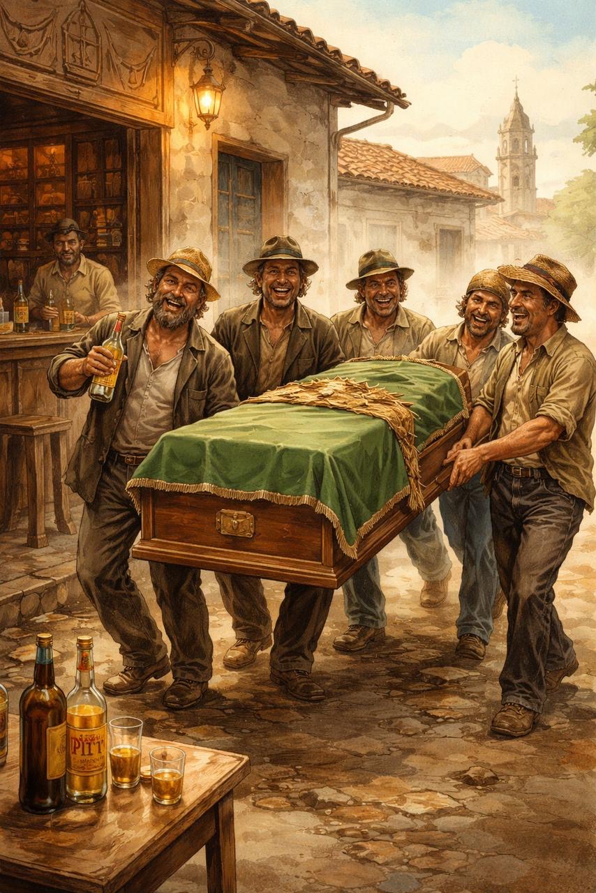 Os rapazes, que tinham o coração leve e a sede constante, aceitaram de bom grado. Apenas impuseram uma cláusula: a condução do corpo se faria em procissão, com paradas regulares em todos os bares do trajeto, sendo o trajeto escolhido por eles.