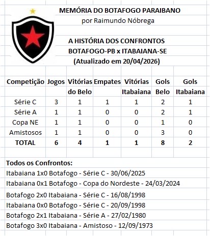 Esse foi, também, o único jogo amistoso que Botafogo e Itabaiana fizeram. Por outro lado, no último confronto entre ambos, o Itabaiana derrotou o Botafogo por 1×0, em 30 de junho de 2025, com gol de David aos 15/2, valendo pela Série C do Campeonato Brasileiro. Vejam, na planilha em anexo, todos os confrontos entre Botafogo x Itabaiana de Sergipe.