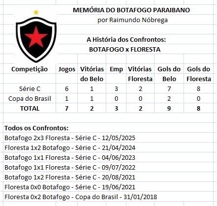 Assim, quando Botafogo e Floresta adentrarem o gramado do Estádio Almeidão no próximo sábado, 25 de abril de 2026, às 19:30 hs, farão o 8o jogo da história dos confrontos entre essas duas equipes nordestinas. Veja a estatística completa dos confrontos na planilha em anexo…