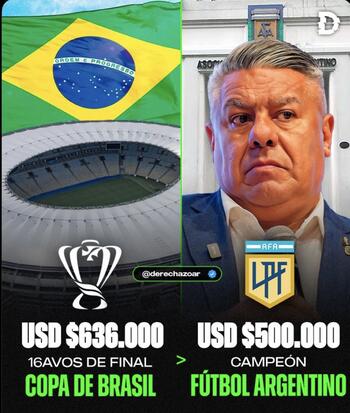 A comparação é vergonhosa: o campeão argentino recebe 500 mil dólares, enquanto no Brasil, os prêmios por conquistas nacionais e continentais chegam à casa das dezenas de milhões.