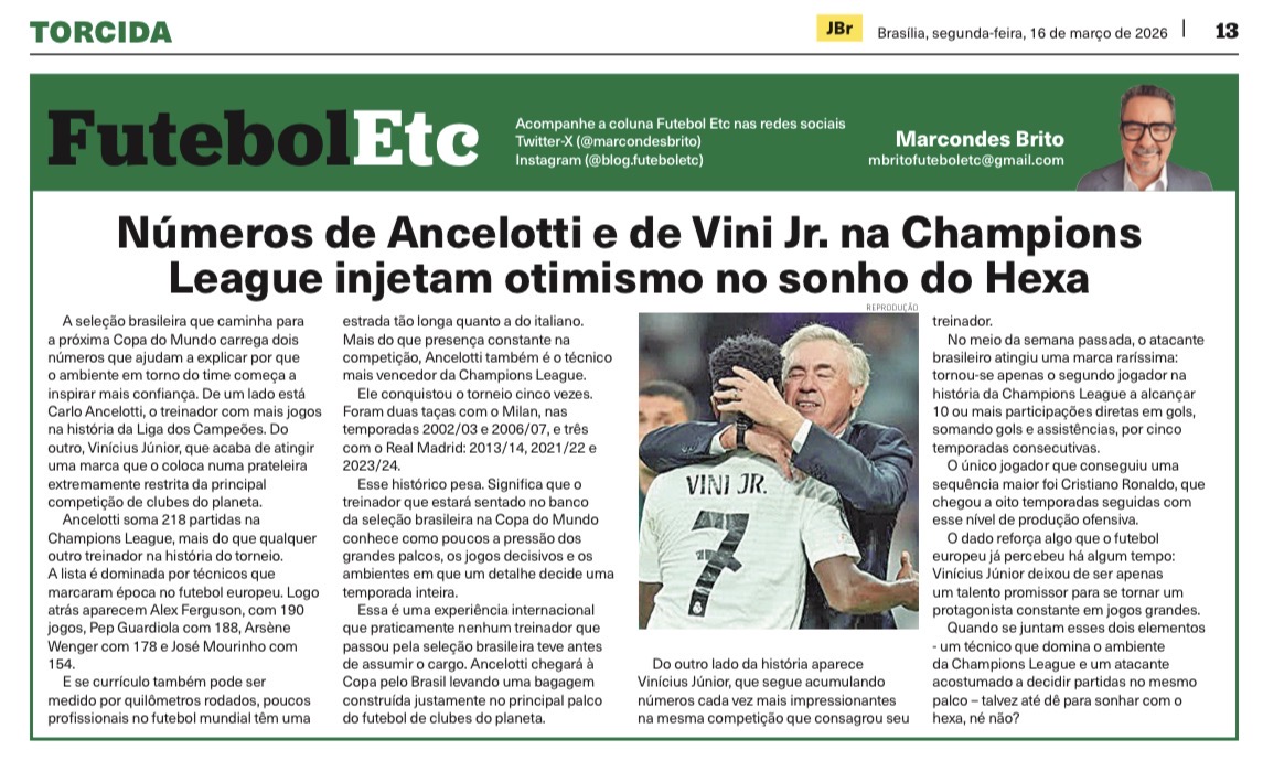 A seleção brasileira que caminha para a próxima Copa do Mundo carrega dois números que ajudam a explicar por que o ambiente em torno do time começa a inspirar mais confiança. De um lado está Carlo Ancelotti, o treinador com mais jogos na história da Liga dos Campeões. Do outro, Vinícius Júnior, que acaba de atingir uma marca que o coloca numa prateleira extremamente restrita da principal competição de clubes do planeta.