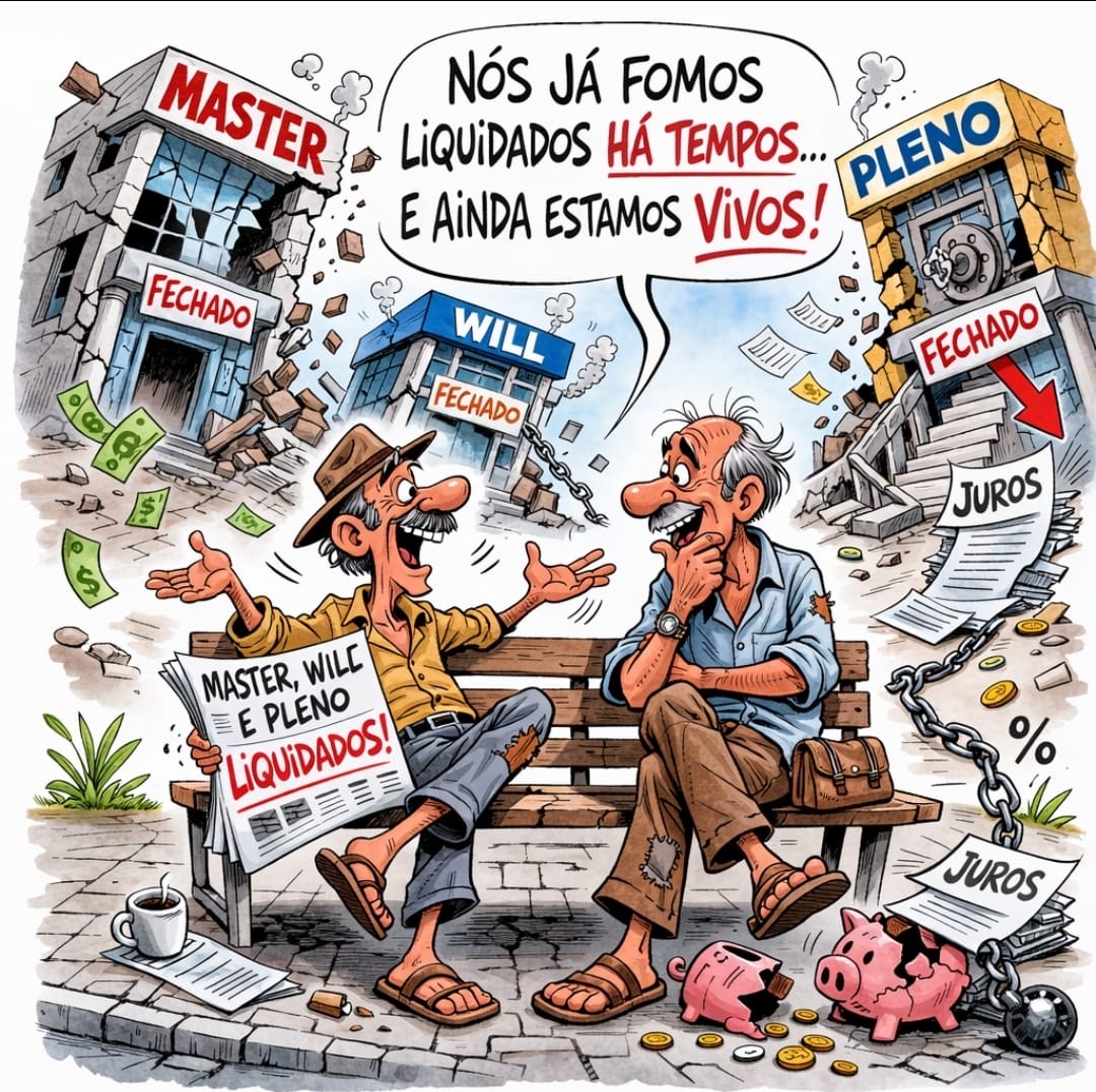 João Tranguelo encontrou Chico Martírio na calçada, comentando as liquidações dos bancos Master, Will e Pleno, cada um caindo como castelos de areia no vendaval das auditorias. Chico, coçando o queixo, soltou: