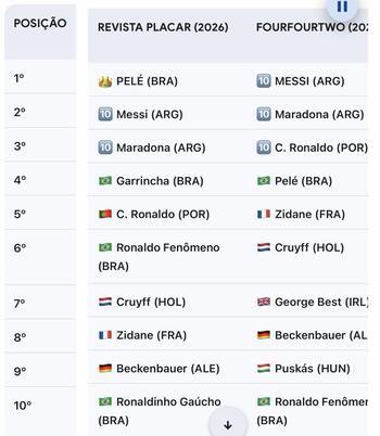 Em 2022, a tradicional revista britânica FourFourTwo publicou o seu ranking dos maiores da história do futebol. A lista provocou debate imediato ao colocar Lionel Messi em primeiro lugar e relegar Pelé apenas à quarta posição, atrás também de Diego Maradona e Cristiano Ronaldo.