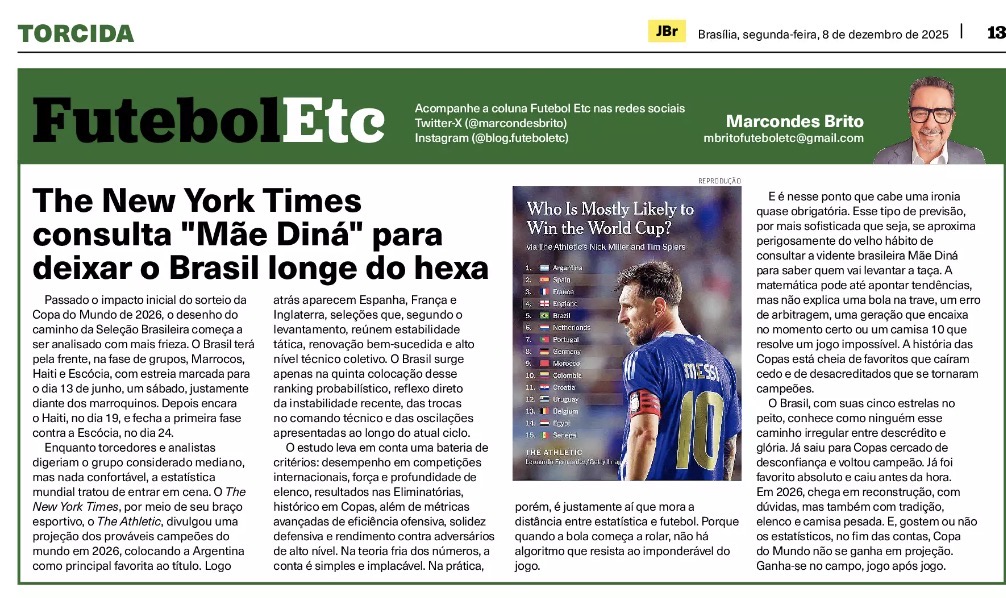 E é nesse ponto que cabe uma ironia quase obrigatória. Esse tipo de previsão, por mais sofisticada que seja, se aproxima perigosamente do velho hábito de consultar a vidente brasileira Mãe Diná para saber quem vai levantar a taça. A matemática pode até apontar tendências, mas não explica uma bola na trave, um erro de arbitragem, uma geração que encaixa no momento certo ou um camisa 10 que resolve um jogo impossível. A história das Copas está cheia de favoritos que caíram cedo e de desacreditados que se tornaram campeões.