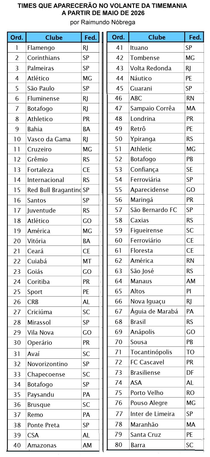 Segue listagem dos 80 times a participarem do Volante da Timemania, a partir de maio de 2026, tomando-se como referência o Ranking 2026, divulgado pela CBF, em seu site.
