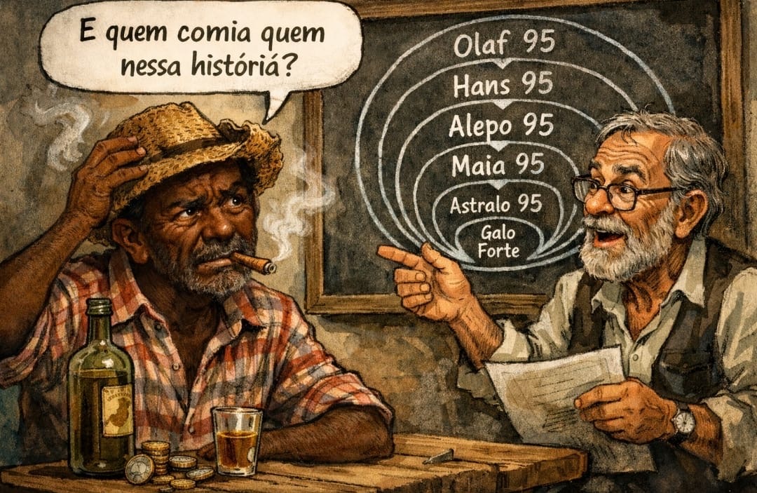 Tragando o pacaia de Arapiraca, lembrava das travessuras enquanto o intelectual Zé de Lourenço tentava explicar a embolada financeira: o fundo Olaf 95 era o único dono do Galo Forte, mas também o único investidor do Hans 95, que por sua vez era o único investidor do Alepo 95, que investia sozinho no Maia 95, que por fim sustentava o Astralo 95 — este, o único investidor do próprio Galo Forte.