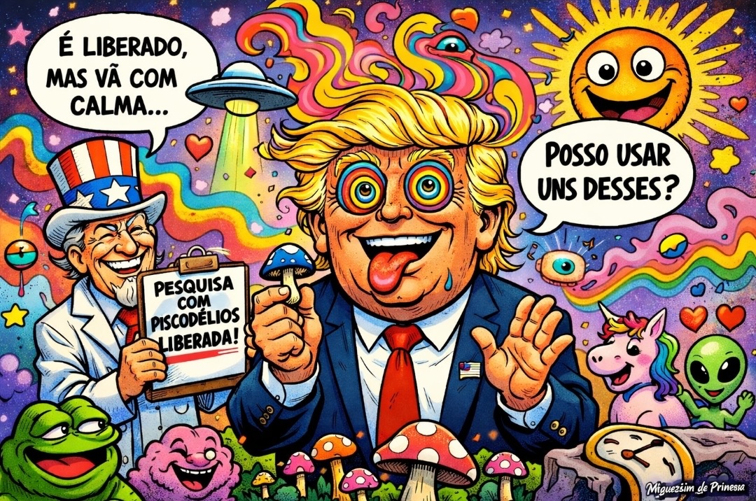 Dizem que Donald Trump resolveu liberar pesquisa com psicodélicos. Até aí, ciência é ciência. O problema começou quando ele perguntou, com a naturalidade de quem pede ketchup: “posso usar?”.