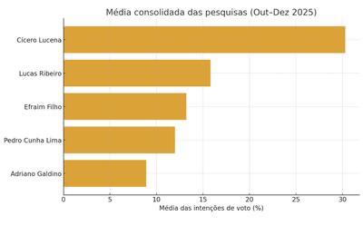 No retrato atualizado de outubro ao início de dezembro, Cícero aparece com 30,3% das intenções de voto na média dos institutos. Lucas Ribeiro surge em seguida, com 15,8%, enquanto Efraim Filho tem 13,2%. Pedro Cunha Lima, que vinha em trajetória de queda nas últimas rodadas, aparece com 12,0%. Adriano Galdino, que deixou a disputa, permanece congelado na série histórica com 8,9%.