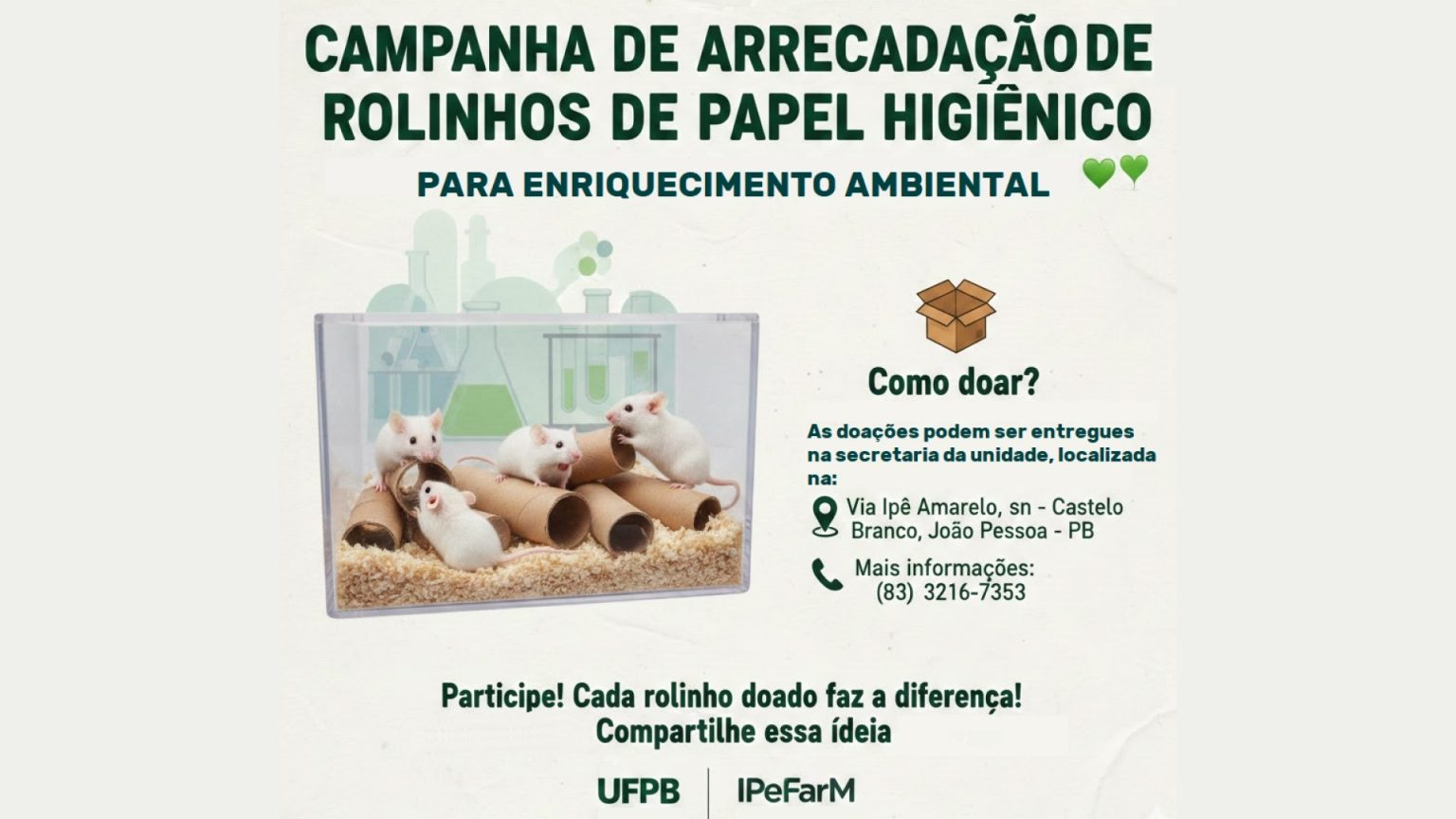 Com esse objetivo a Unidade de Produção Animal do Instituto de Pesquisas em Fármacos e Medicamentos (IPeFarM) da Universidade Federal da Paraíba (UFPB) realiza uma campanha permanente de arrecadação para coletar esses rolinhos.