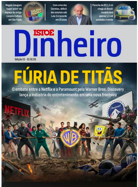 IstoÉ Dinheiro – Fúria de titãs – Desloca o foco para o embate global do entretenimento, retratando a guerra entre gigantes como Netflix, Paramount e Warner Bros. Discovery. A capa sugere que essa disputa vai além do streaming, redefinindo modelos de negócio, consumo cultural e o próprio futuro da indústria audiovisual.