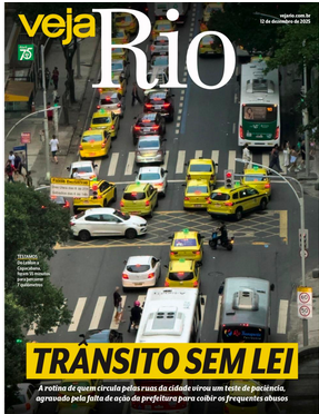 Veja Rio – Trânsito sem lei – Traz o cotidiano urbano como protagonista e denuncia o colapso da mobilidade na cidade. A capa retrata o trânsito como um teste diário de paciência, agravado pela falta de fiscalização e de ação do poder público, transformando ruas e cruzamentos em símbolos visíveis do descontrole urbano.