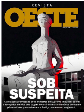 Oeste – Sob suspeita – Reforça a desconfiança sobre o STF ao abordar relações consideradas promíscuas entre ministros e advogados de réus poderosos. A capa sustenta a narrativa de que a Justiça brasileira vive uma crise ética profunda, em que conflitos de interesse ameaçam os pilares institucionais e corroem a credibilidade do Judiciário.