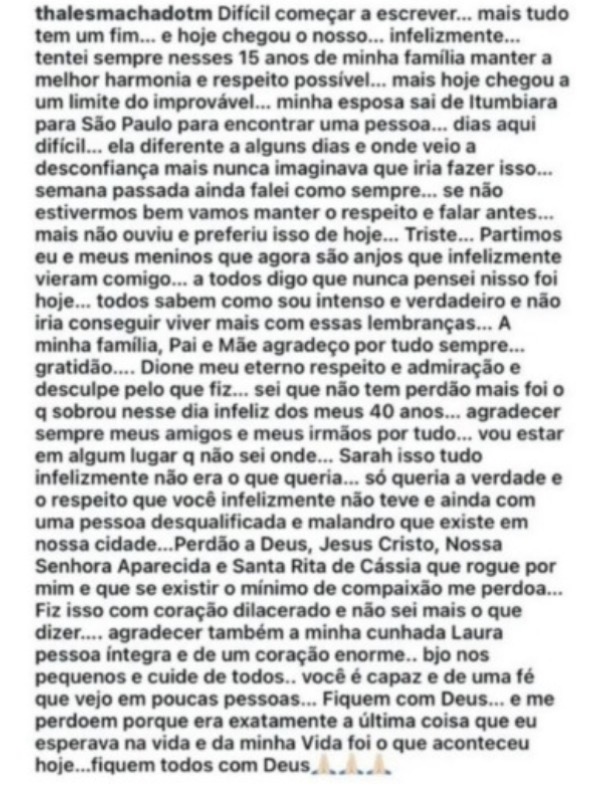 A seguir, a íntegra da carta deixada por Thales Machado, documento que agora integra os autos da investigação policial.