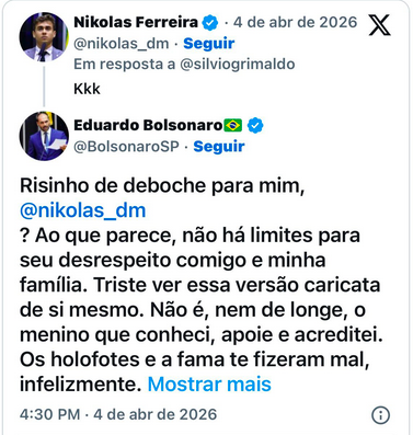 A crise ganhou corpo quando Eduardo reagiu diretamente ao que interpretou como deboche. “Não há limites para o desrespeito comigo e minha família”, afirmou, deixando claro que não tratava o episódio como algo menor. Na mesma linha, ele também demonstrou frustração pessoal: “Triste ver essa versão caricata de si mesmo. Não é, nem de longe, o que conheci, apoiei e acreditei”.