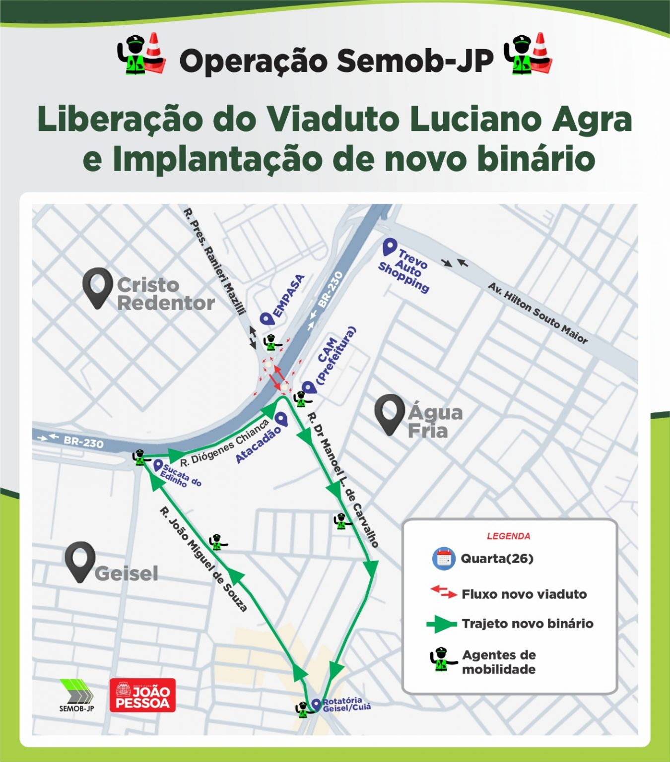 Com a conclusão das obras do Viaduto Luciano Agra. Com isso, a Superintendência Executiva de Mobilidade Urbana de João Pessoa (Semob-JP), em parceria com o Departamento de Estradas de Rodagem da Paraíba (DER-PB), implantará um binário entre as ruas Dr. Manoel Lopes de Carvalho e João Miguel de Souza, no bairro do Geisel.