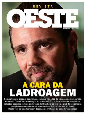 Revista Oeste — “A cara da ladroagem” – Adota um tom acusatório ao personalizar o que chama de um grande esquema de corrupção financeira. A capa busca provocar indignação ao associar imagem e denúncia, reforçando a narrativa de que escândalos bilionários não são abstratos, mas têm rostos, histórias e consequências diretas para o dinheiro público e para a confiança nas instituições.
