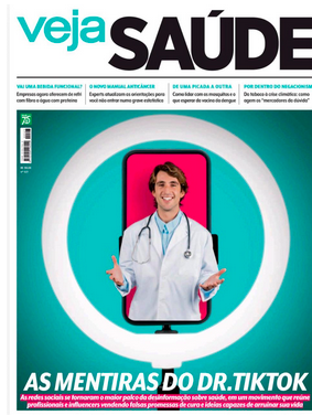 Veja Saúde – O foco é a desinformação médica nas redes sociais. A figura do “doutor TikTok” simboliza influenciadores que, sem base científica, vendem soluções milagrosas e confundem milhões de pessoas. A capa reflete um momento de choque entre ciência e engajamento digital, alertando para os riscos reais à saúde pública em um ambiente dominado por likes, promessas fáceis e autoridade falsa.
