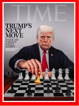 Time – A publicação americana retrata Donald Trump como um estrategista de xadrez, sugerindo que cada movimento seu é calculado no tabuleiro da política internacional. A capa reflete um mundo em expectativa e tensão, tentando decifrar quais serão os próximos passos do presidente em política externa e como eles podem reconfigurar alianças, conflitos e equilíbrios globais.