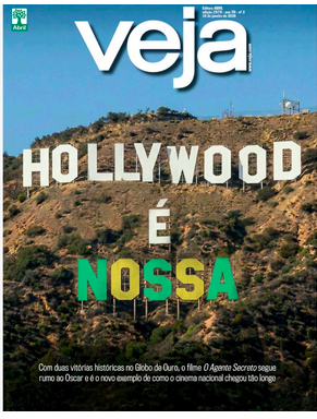 Veja – A revista conecta cultura, identidade e política ao afirmar que Hollywood “é nossa”. A capa celebra o bom momento do cinema brasileiro, impulsionado pelo sucesso internacional de O agente secreto e pela presença cada vez mais sólida do país em premiações globais. O discurso é de afirmação cultural e maturidade artística, mostrando o Brasil como produtor relevante de narrativas universais.