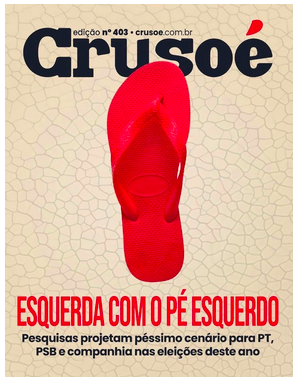 Crusoé – A capa aposta em metáfora visual direta para retratar o momento da esquerda brasileira. A sandália virada para o lado esquerdo simboliza um cenário político desfavorável para PT, PSB e aliados, com pesquisas indicando dificuldades eleitorais e perda de tração em vários estados. O tom é de alerta interno, menos ideológico e mais pragmático, sugerindo que o campo progressista entra no ano sob pressão e sem margem para erros estratégicos.