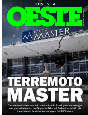 Oeste – Com linguagem visual agressiva, a capa trata o caso do Banco Master como um terremoto institucional. A imagem de rachaduras no prédio simboliza um escândalo de grandes proporções, com efeitos políticos, econômicos e jurídicos. A narrativa sugere um abalo profundo no sistema financeiro e levanta suspeitas sobre responsabilidades que alcançam instâncias altas do poder.