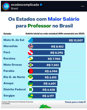 Segundo os dados, a remuneração média inicial dos professores da rede estadual paraibana é de R$ 6.944. No recorte regional, o valor fica atrás apenas do Maranhão e supera estados com maior capacidade econômica, como São Paulo, Pernambuco, Distrito Federal e Rio Grande do Sul.