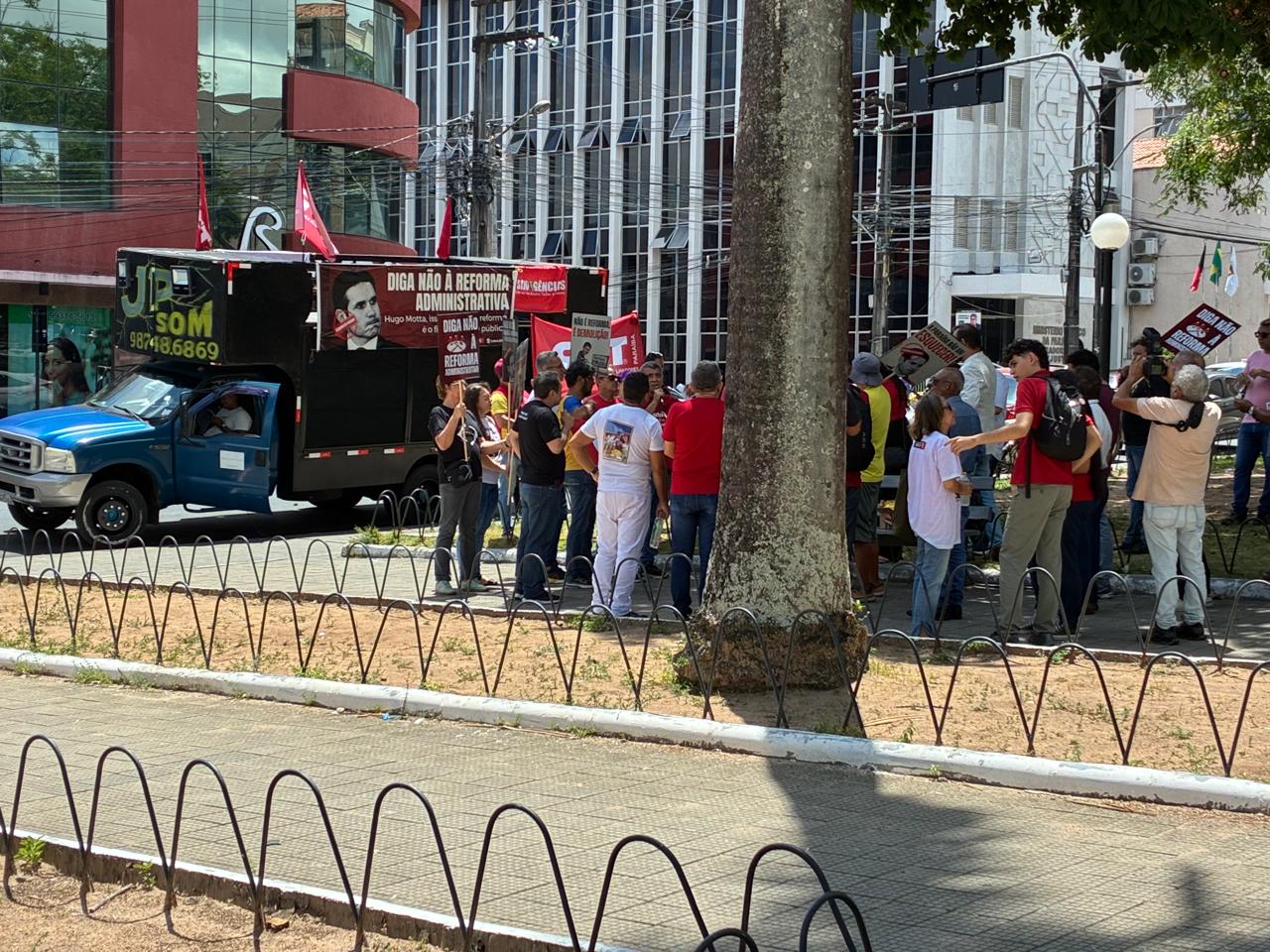 Os sindicalistas levaram carro de som, faixas, banceiras e cartazes, inclusive, com o rosto do presidente da Câmara dos Deputados, o deputado federal paraibano Hugo Motta. Eles se concentram diante da ALPB.